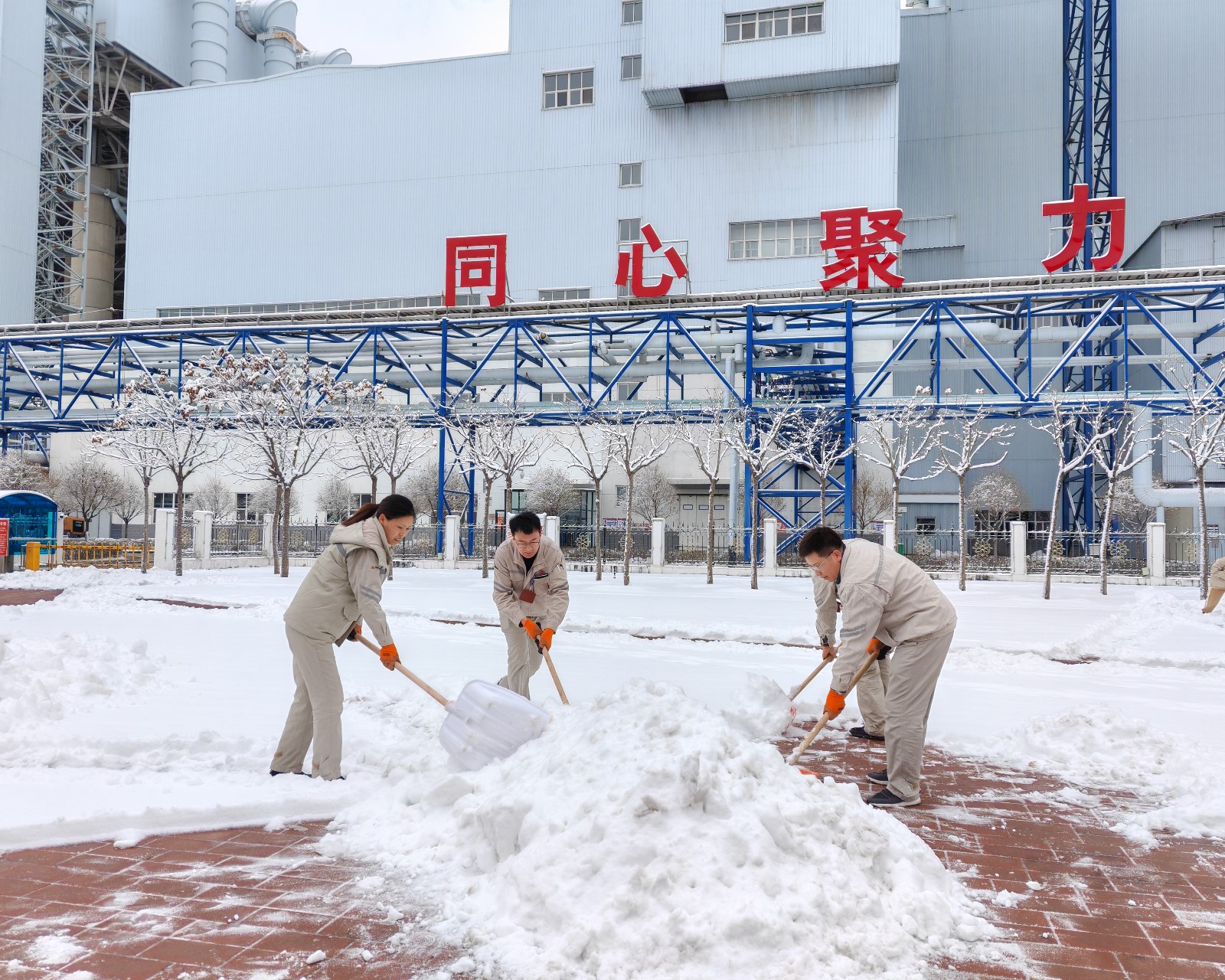 本網訊 近日,一場大面積的降雪為蔚州能源公司披上了新裝。為積極應對積雪、結冰情況,保障職工安全出行,該公司以“雪”為令,迅速行動,全力開展廠區掃雪除冰行動。