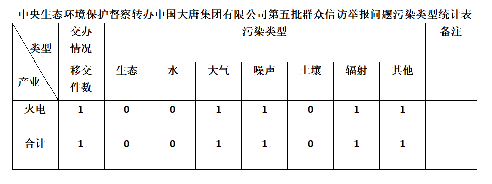 2025年6月7日,中央第七生態環境保護督察組向中國大唐集團有限公司移交第五批群眾信訪舉報件,共計1件,為來電舉報,涉及大氣問題1個、噪聲問題1個、輻射問題1個、其他問題1個。所有舉報件辦理工作已第一時間進入調查核實辦理程序,辦理情況將按照相關要求反饋督察組,并及時向社會公開。
