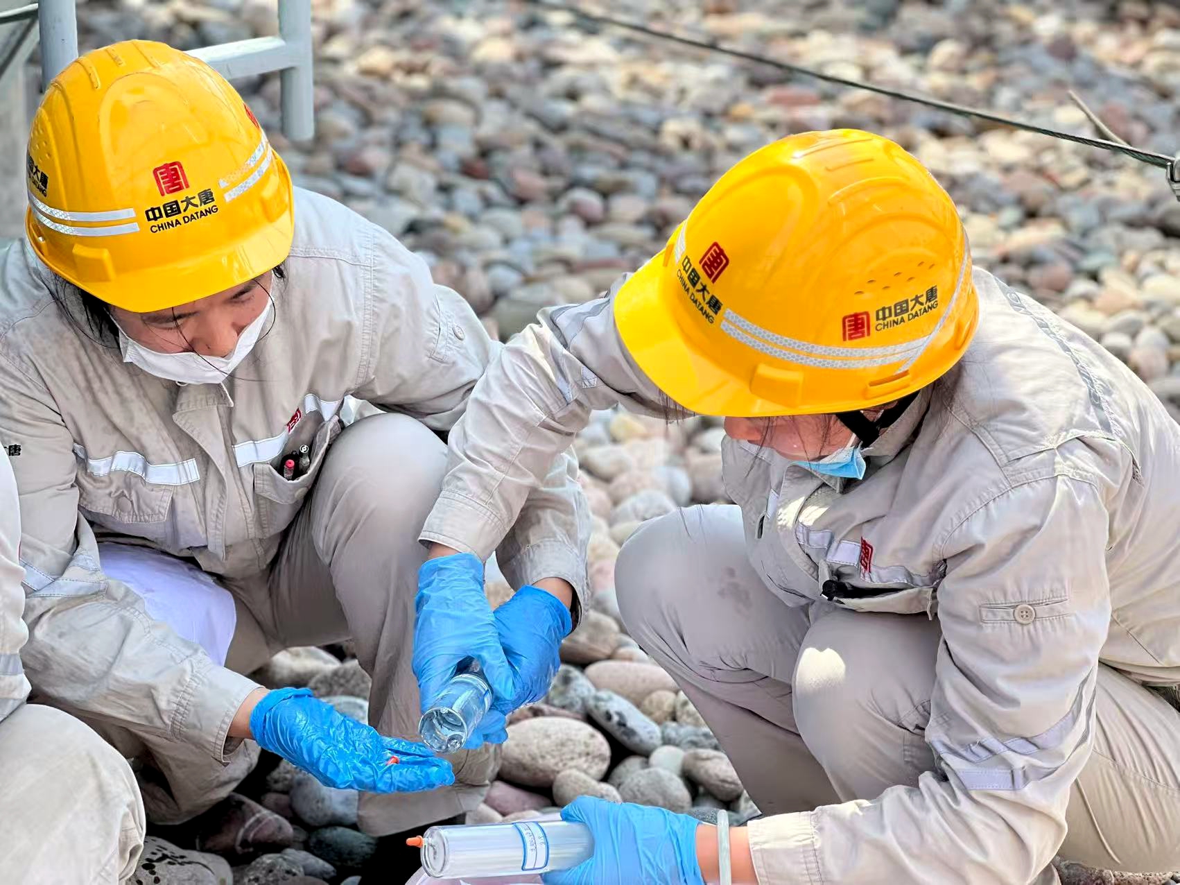 4位身著工裝的“娘子軍”手提取樣瓶,穿梭在設(shè)備之間——有人手里攥著棉布,隨時(shí)準(zhǔn)備擦拭取樣瓶;有人護(hù)著裝滿油樣的取樣瓶,生怕被陽(yáng)光直射影響樣品質(zhì)量。盡管臉龐被曬得通紅,汗水在安全帽帶下匯成細(xì)流往下淌,但遞工具、接樣品、擦瓶身、封瓶口的動(dòng)作,始終有條不紊、一絲不亂。