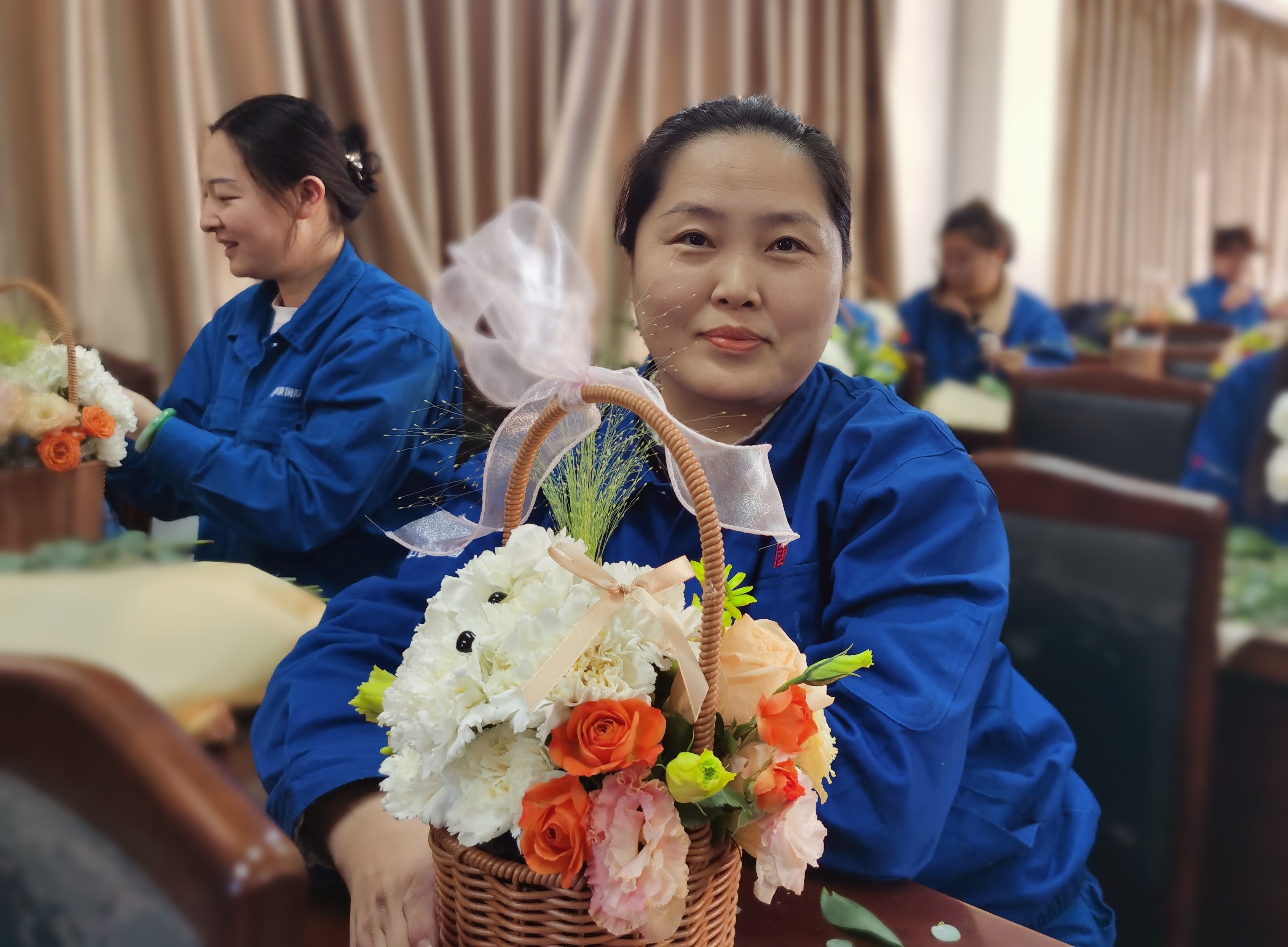 花藝老師先是簡單介紹了插花藝術的起源、發展、工藝等方面知識,隨后向大家介紹了此次藝術插花所使用到的花的種類。實踐環節,在花藝老師的指導下,女職工手中白色浪漫的康乃馨逐漸呈現出萌萌的眼睛,嘟嘟的小嘴,在一雙雙巧手下,一個個可愛的小狗造型呼之欲出。大家發揮想象力和創造力,在主花的周圍整合造型,原本簡簡單單的花草在女職工們的手中變成美麗的花籃。大家看著自己親手制作的插花作品,感到滿滿的幸福和成就感。