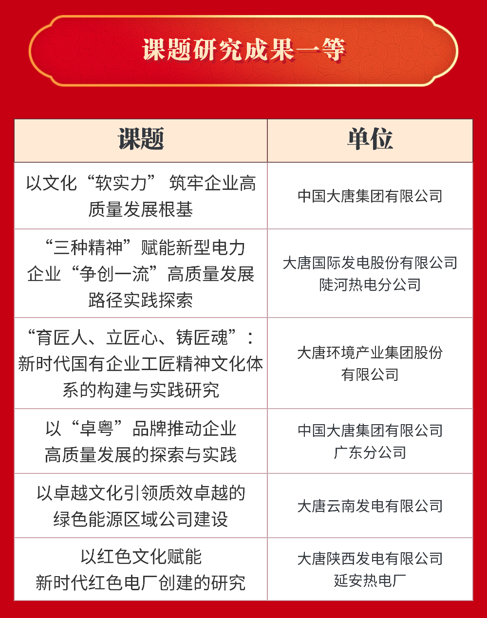 大唐國際發電股份有限公司等22家單位獲評“十四五”企業文化建設與管理典型案例;中國大唐及所屬8家單位獲評“十四五”企業文化建設與管理典型經驗;中國大唐及所屬5家單位獲評課題研究成果一等;大唐國際發電股份有限公司張家口發電分公司等6家單位獲評課題研究成果二等。具體名單如下: